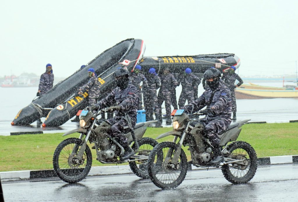 Makassar, Langit gelap dan hujan deras yang mengguyur wilayah latihan tidak mampu meredam semangat baja para prajurit Jalasena Kodaeral VI dalam mempersembahkan atraksi tempur spektakuler yang menggugah adrenalin bertempat di Dermaga Layang Kodaeral VI, Jumat (05/12/2025).