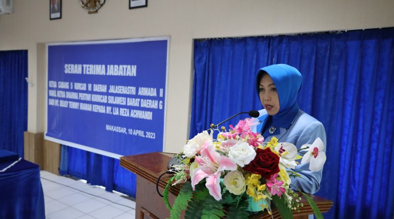 TNI AL Lantamal VI, 10 April 2023, Makassar, Ketua Koordinator Cabang (Korcab) Daerah Jalasenastri Armada (DJA) II Ny. Dewi Amir Kasman memimpin langsung Serah Terima Jabatan (Sertijab) Ketua Cabang 5 Korcab VI DJA II di gedung Panti Perwira (PP) Jaladri 10/04/2023.