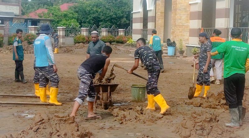 Pasca Banjir dan longsor, Tim Satgas Gulben Lantamal VI Laksanakan Pembersihan di Fasum Kabupaten Luwu-Sulsel