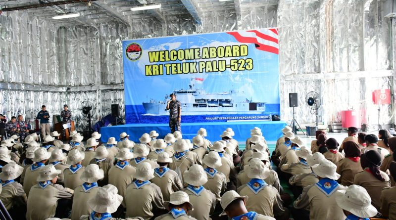 TNI AL, Makassar, 21 November 2022, Peserta Pelayaran Pembinaan Pembentukan Karakter Maritim (PPKM) Sail Tidore tiba di Kota Makassar, Sabtu pagi (19/11/2022). Kedatangannya dengan menggunakan KRI Teluk Palu – 523 tersebut disambut dengan atraksi Semaphore oleh Anggota Saka Bahari Provinsi Sulawesi Selatan di Dermaga Layang Mako Lantamal VI.
