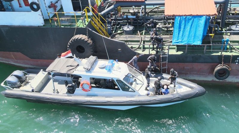 TNI AL, Lantamal VI, 14 September 2023, Prajurit Satuan Patroli (Satrol) Lantamal VI melaksanakan latihan Visit Board Search and Seizure (VBSS) bertempat di perairan Kota Makassar, Kamis, (14/ 09/2023).