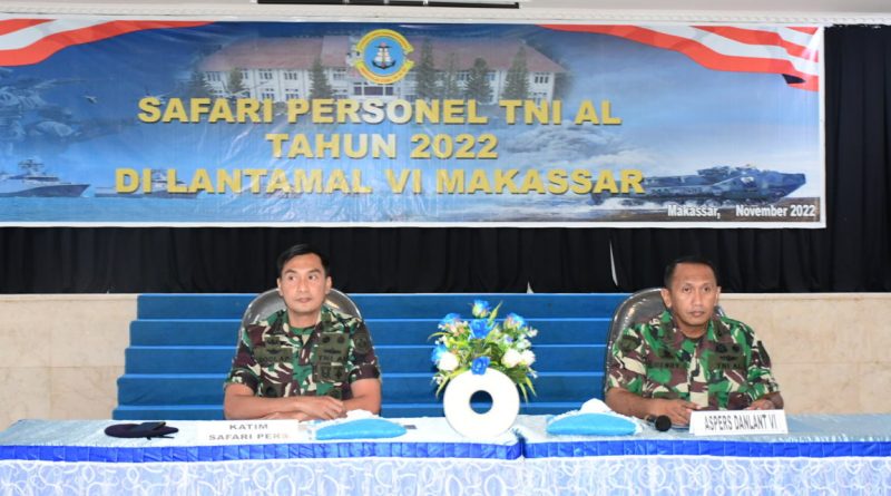 Makassar, Seluruh prajurit dan Pegawai Negeri Sipil (PNS) Pangkalan Utama TNI AL VI (Lantamal VI) menerima pengarahan personel oleh Tim Safari Personel dari Markas Besar TNI AL (Mabesal), bertempat di gedung Hasanuddin Markas Komando (Mako) Lantamal VI, Selasa (08/11/2022).